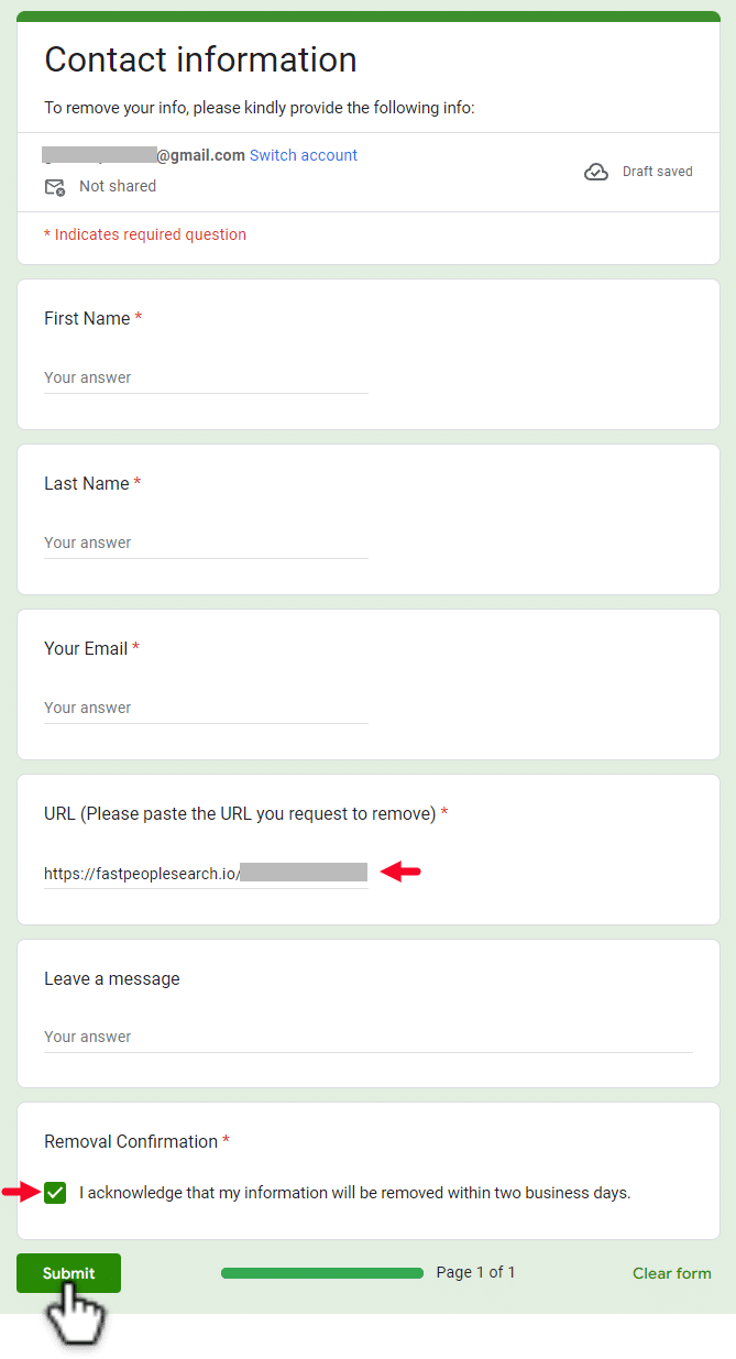 6) In order to complete your opt out from FastPeopleSearch.io, you need to have a Google Gmail account. Complete the form with your first and last name, Gmail account address, your profile URL that you copied in Step 3, and the reason for your opt out request. Then click Submit.