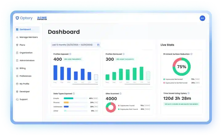 Organizations measure ROI through Optery’s business dashboard, which provides real-time metrics including: