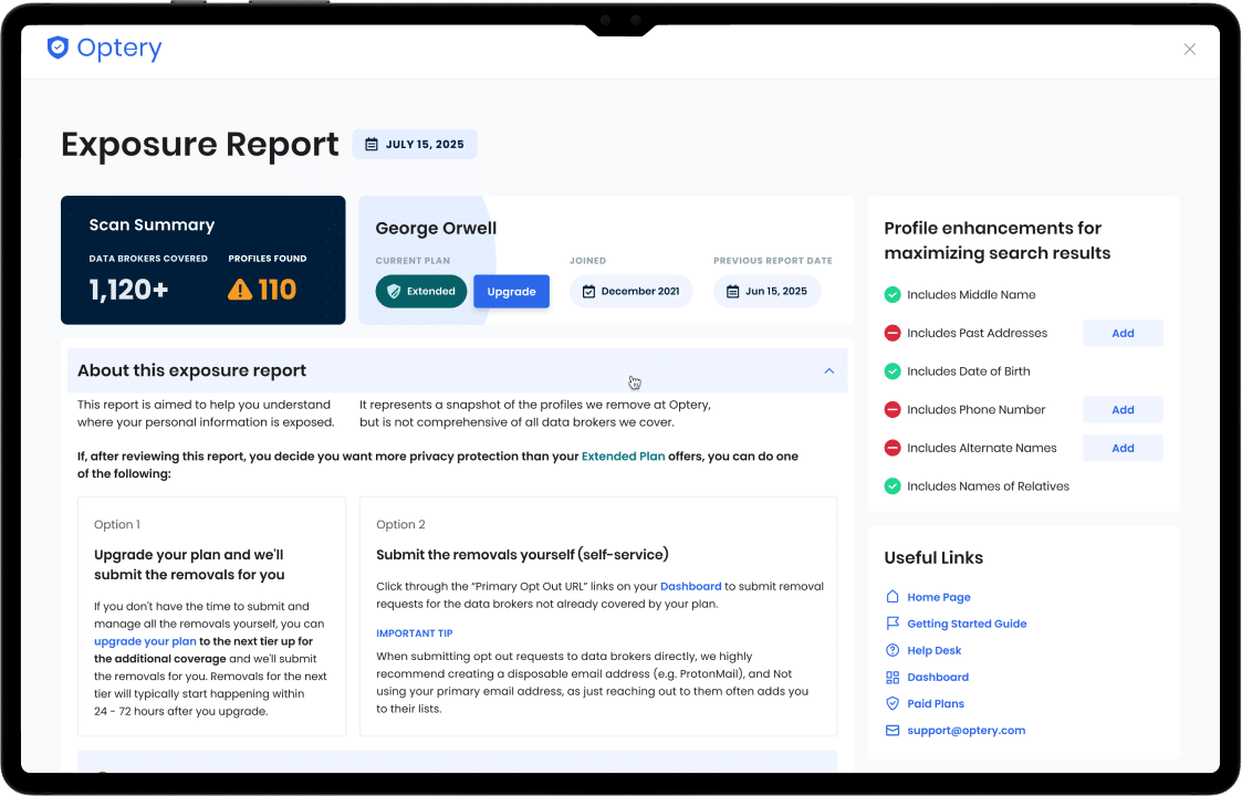Optery has proven remarkably effective at protecting my personal information online. When I first used their service, I was shocked to discover over 150 data broker listings containing my sensitive information – including details I never expected to be public, such as my car's VIN number. Within months, they successfully reduced these listings from 150 to just 23.What sets Optery apart is their thorough documentation process. They provide screenshots from each data broker's website showing the removal progress, saving me countless hours of individually verifying removals. This transparency gives me confidence that they're actively working on my behalf.The results have been tangible: I've experienced a significant decrease in spam emails and unsolicited sales calls. The service has been so effective that I've recommended it to several friends, all of whom have reported similar positive experiences. For anyone concerned about their digital privacy, Optery delivers real results with impressive transparency."Full Review