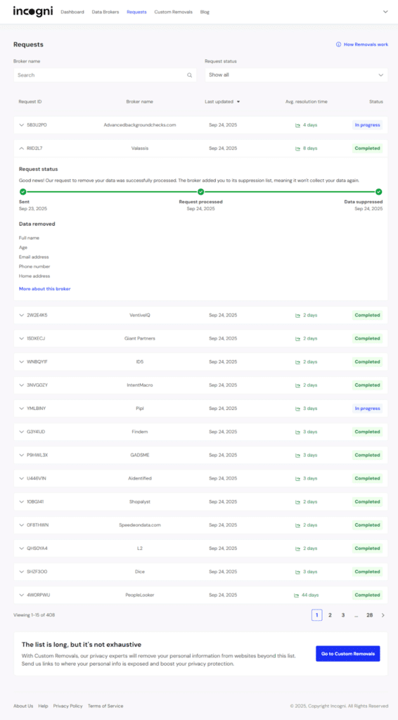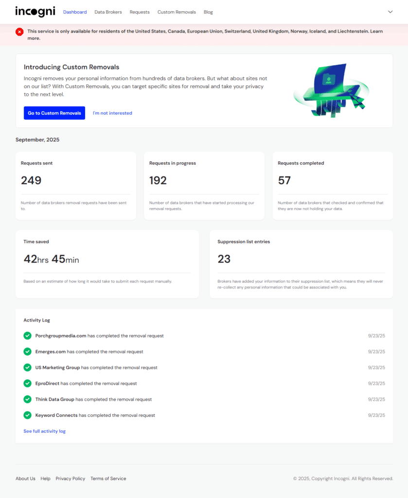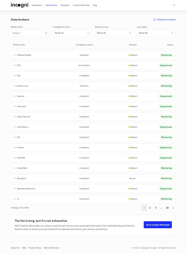 💡 Data broker coverage with Incogni is stronger than most in the personal data removal industry, but not as Optery. For example, Optery covers 50%+ more data brokers for automated removals than Incogni (645 covered by Optery vs. 420 covered by Incogni, at the time of this writing). Incogni’s reach across data brokers and people-search sites is comparatively narrow, leaving gaps in removal for those who want comprehensive protection. For example, some high-profile brokers, like Whitepages and Instant Checkmate, are not part of Incogni’s automated coverage (at this time of this writing). Users must handle those removals themselves. Optery’s higher-tier plans include these and other difficult sites through built-in coverage or its Custom Removals featureIts offering is relatively uniform, without the tiered plans or Optery’s Expanded Reach option that gives customers flexible options to expand coverage modularly. This means that paying customers may still find their information exposed in places Incogni does not cover.