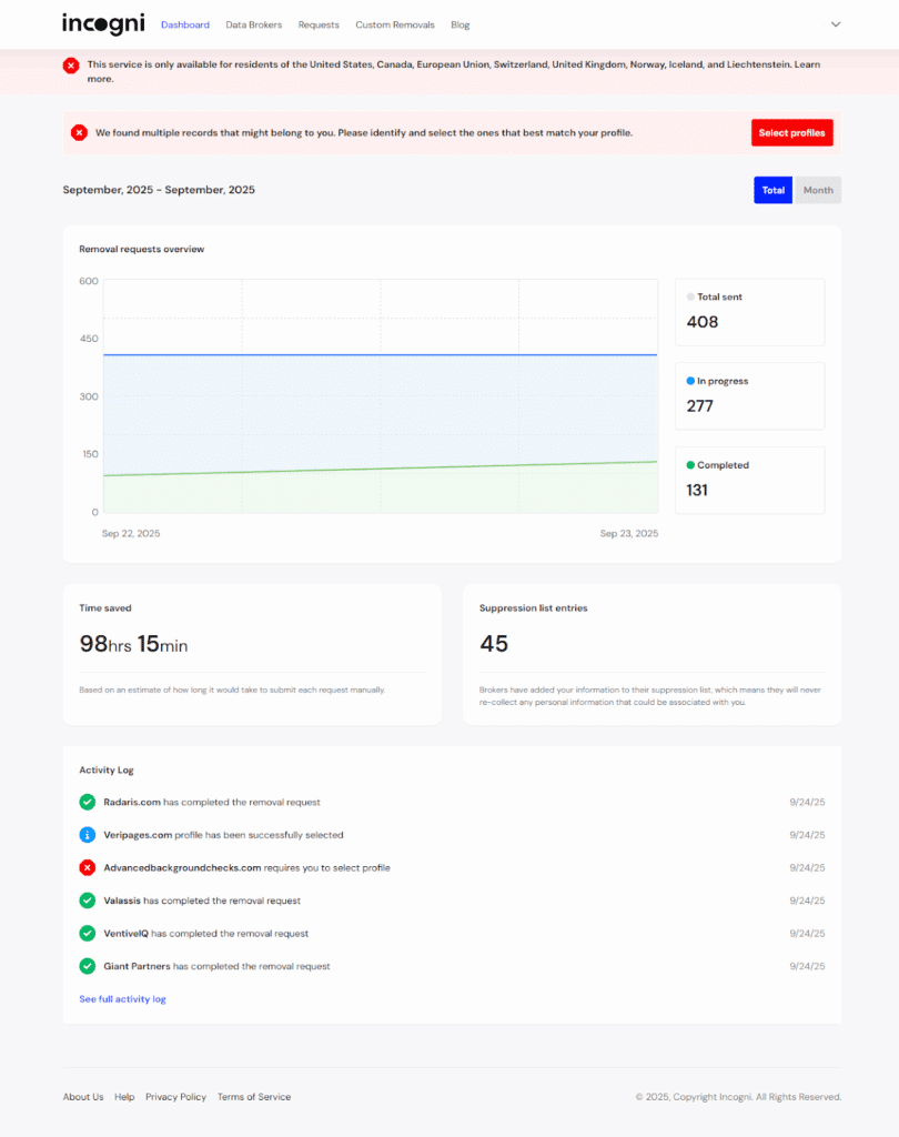 After checking back a few days later, Incogni reported 408 requests had been sent (an additional 159 requests), with 277 in progress and 131 completed. The fact that Incogni seems to send over 200 opt-out requests within 10 minutes of signing up indicates Incogni most likely automatically submits removal requests with no manual intervention or scanning or validation beforehand, and is most likely batching and blasting opt outs indiscriminately.