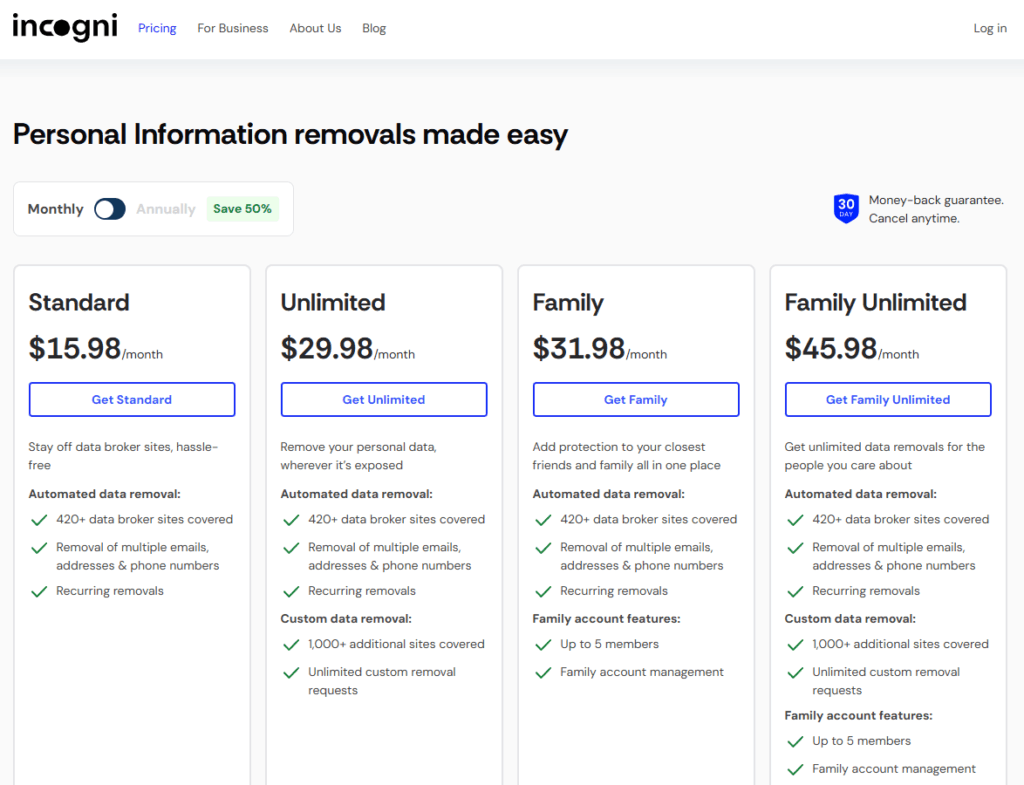Additionally, the Incogni product is straightforward and easy to understand, with a clean, user-friendly interface. Incogni offers two tiers: a Standard plan at $15.98 per month or $95.88 per year (about $7.99/month when billed annually), and an Unlimited plan starting at $179.88 per year (about $14.99/month). The Unlimited plan includes features such as custom removal requests and expanded support. Overall, the service provides an accessible customer experience, and reviews consistently highlight its simplicity and ease of use