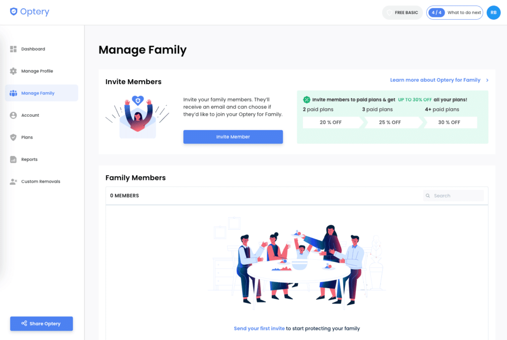 Optery for Family allows you to add and manage unlimited family members. To be clear, there is additional cost for each additional family member account managed. Discounts increase as more family members are added. Get 20% off all plans for 2 members, 25% off for 3 members, and 30% off for 4 or more members.