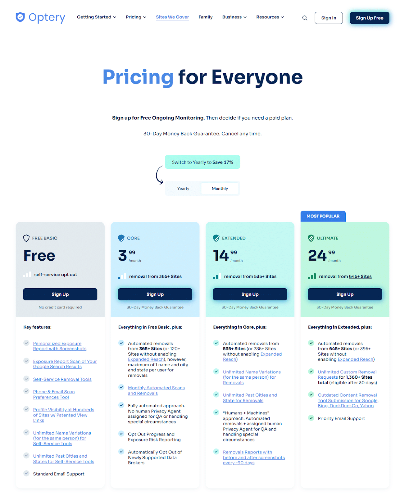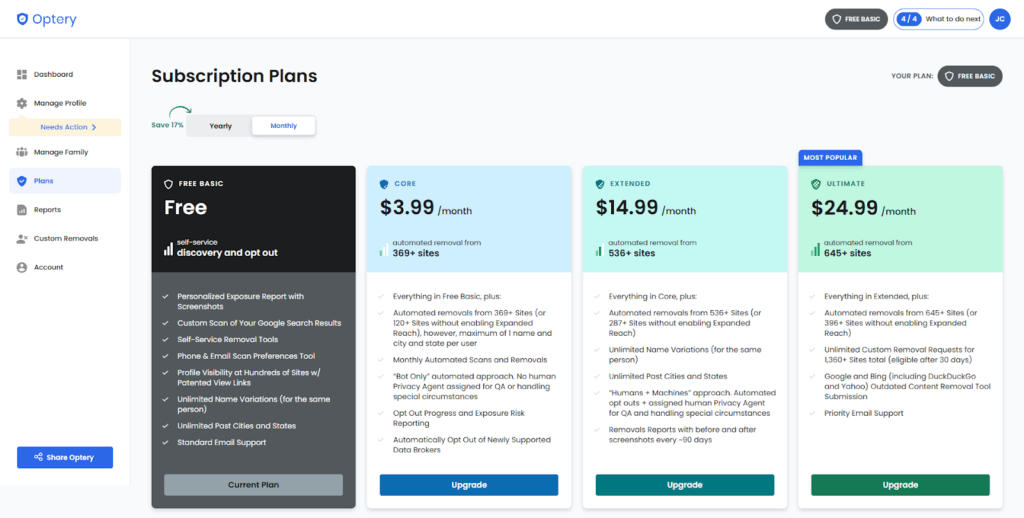 Optery provides flexible Monthly or Yearly plans without lengthy contracts. You can pay month-to-month and pause or cancel at anytime. Optery also allows easy upgrades or downgrades between subscription tiers (Free Basic, Core, Extended, Ultimate) and plan terms (Monthly or Yearly) at any time with pro-rated billing.