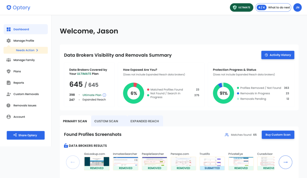 Optery scans hundreds of data broker sites and discovers an average of approximately ~100 exposed profiles per user. When customers of other personal data removal services (e.g. Incogni, DeleteMe, etc) create a free Optery account for the free Optery scan, Optery finds ~50 exposed profiles the others have missed per user on average. Optery typically generates reports within ~30 minutes after the free sign up. These reports include real-time screenshots that demonstrate where your profile is exposed, providing tangible evidence of Optery’s effectiveness. Furthermore, Optery offers full and complete access to all the exposed profiles in the report without even requiring a credit card or a paid account.