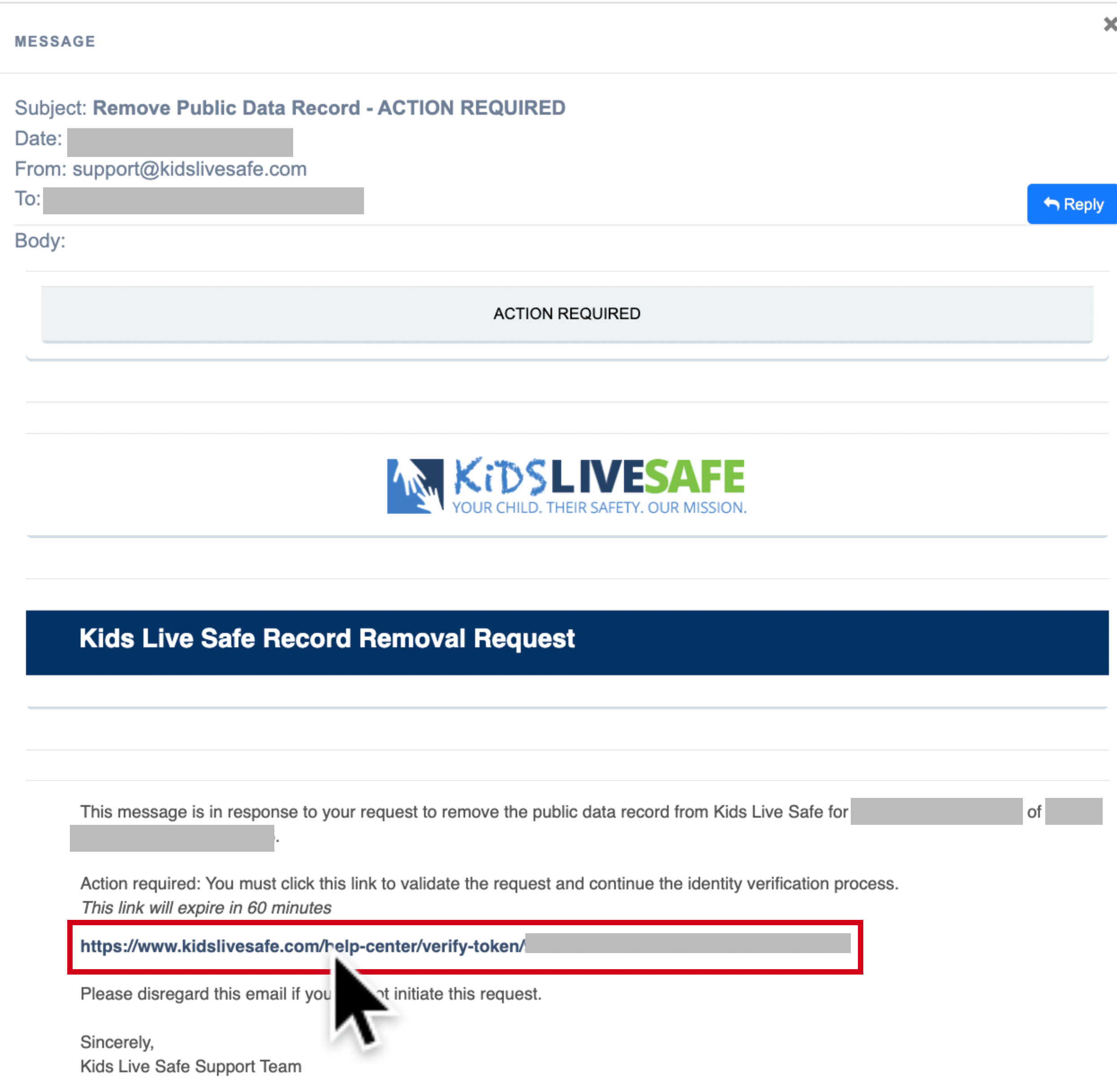 7) Check your email inbox for an email from KidsLiveSafe.com. Open the email and click the link. Clicking the link will validate your opt out request.