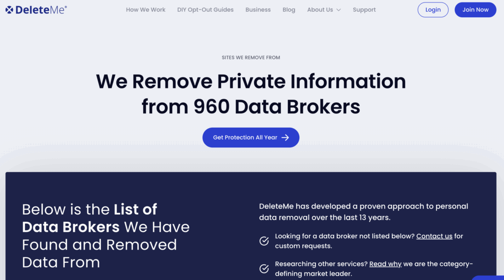 DeleteMe’s homepage highlights “960+ data brokers” under a bold “Sites We Remove From” headline. However, based on our research into the fine print, only a portion of those sites are handled automatically in a standard consumer subscription: