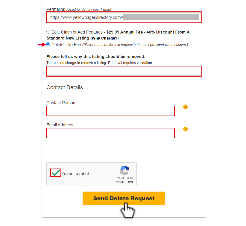 4) Paste the profile URL on the “Permalink” box. Choose the “Delete – no Free” option, provide the reason for your opt out, then fill in the ‘Contact Details’ form, perform the CAPTCHA, and click the Send Delete Request button.